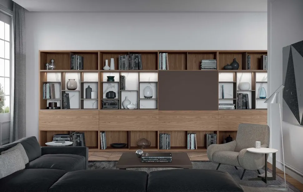 La zona giorno si compone di molteplici mobili ed elementi accessori capaci di completare lo spazio ottimizzando ogni angolo; tra questi deve esserci una parete attrezzata come il modello Mood 14 di Astor Mobili presente in foto, pensata per dare vita a un soggiorno operativo e pratico.