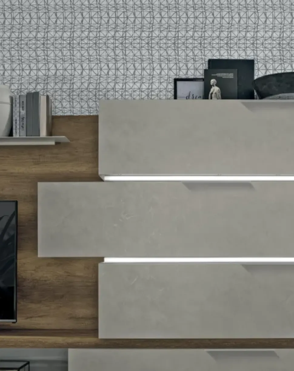 - Nella fotografia è ben visibile il laminato materico con cui questa parete attrezzata è stata costruita: la pluriennale professionalità Tomasella assicura materiali sempre resistenti e esteticamente gradevoli.