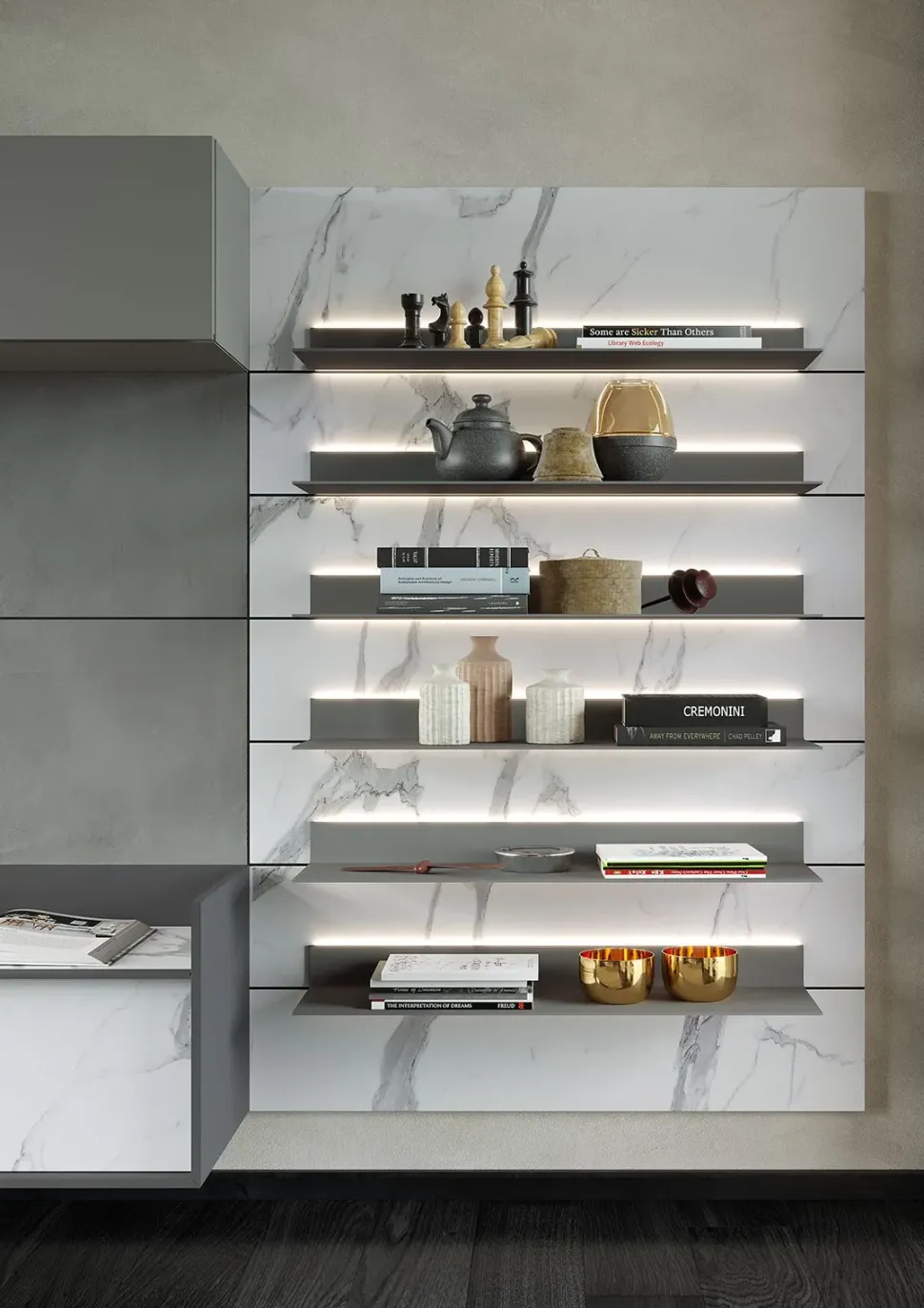 Nella fotografia รจ ben visibile il laccato opaco con cui questa parete attrezzata รจ stata realizzata: la pluriennale esperienza Astor Mobili assicura materiali sempre resistenti e belli.