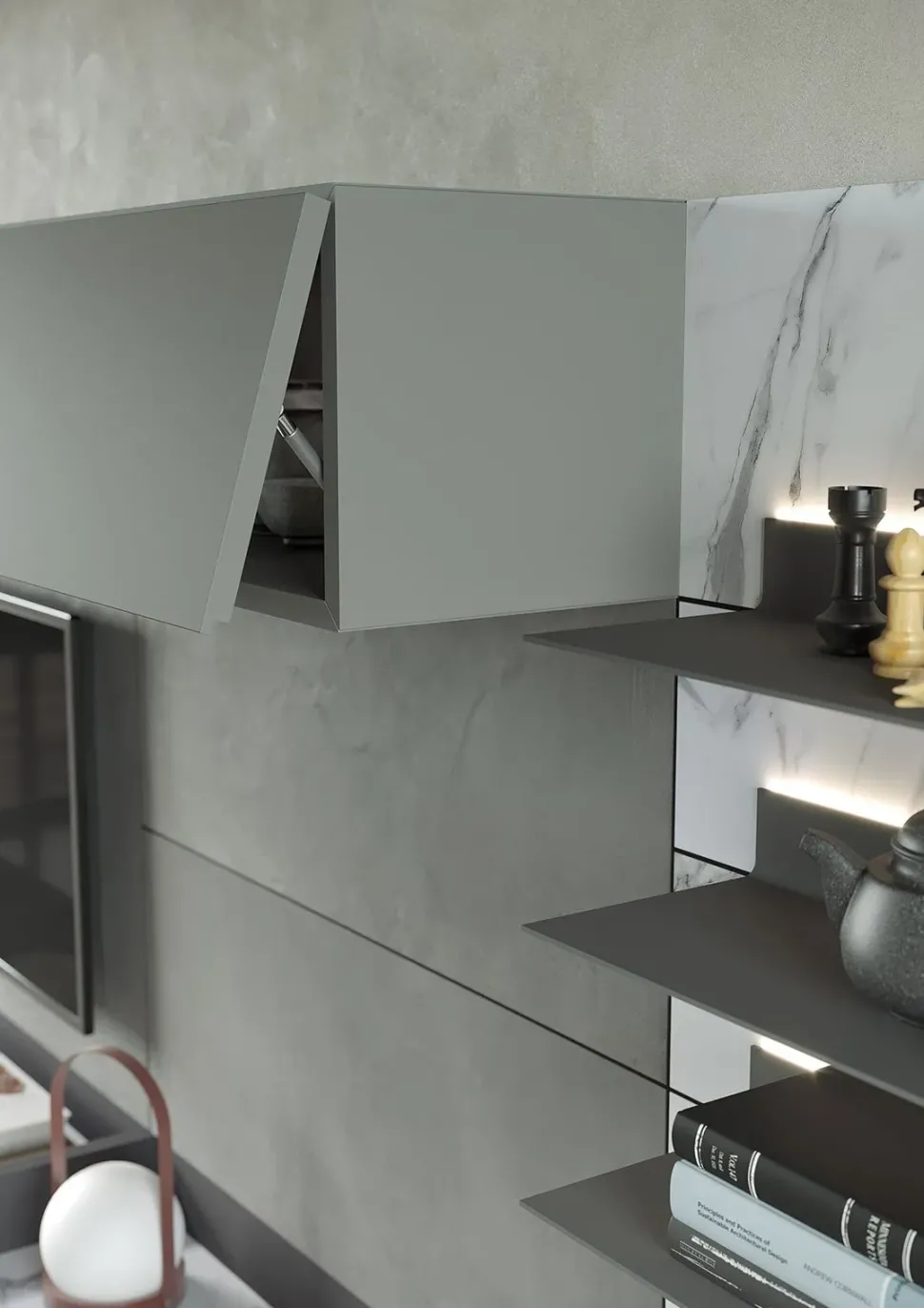 Per risolvere differenti esigenze abitative, Astor Mobili ha messo a punto una serie di mobili ed elementi accessori di differenti tipologie: il modello mostrato in foto, per esempio, รจ sospeso.