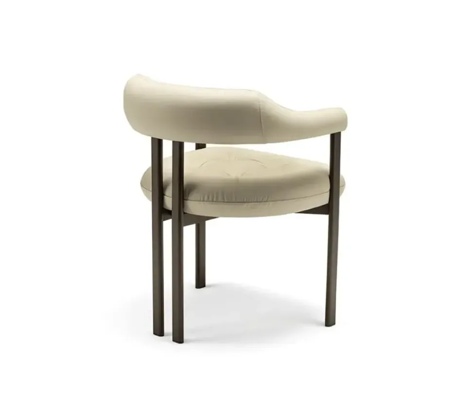 Tra la seduta e la base si crea un gioco di contrasti intrigante, sovrapponendo materiali morbidi o metallici, volumi pieni o vuoti, forme accoglienti o incisive. Le tre gambe sottili sono costituite da tubi metallici a sezione ellittica, rifiniti con verniciature goffrate in diverse tonalità eleganti, per abbinarsi al meglio con la vasta gamma di tessuti e pelli a campionario.