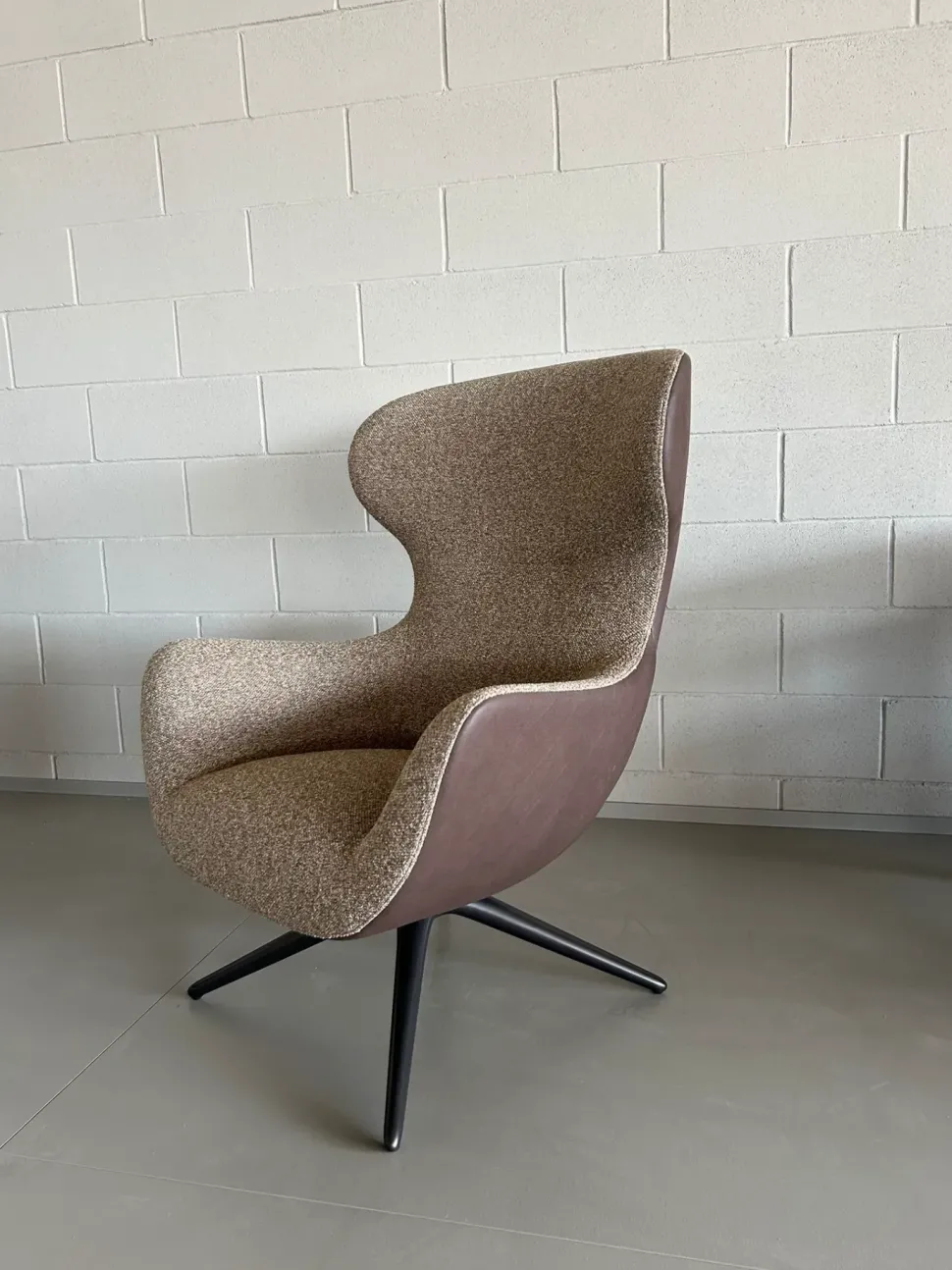 Poltrona Mad Joker con braccioli e base girevole nel rivestimento interno fin.CAT E Carson col.05 Pernice e rivestimento esterno CAT.S Pelle Silk col.04 Ebano, basamento fin.Brown Nickel opaco