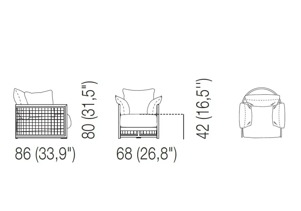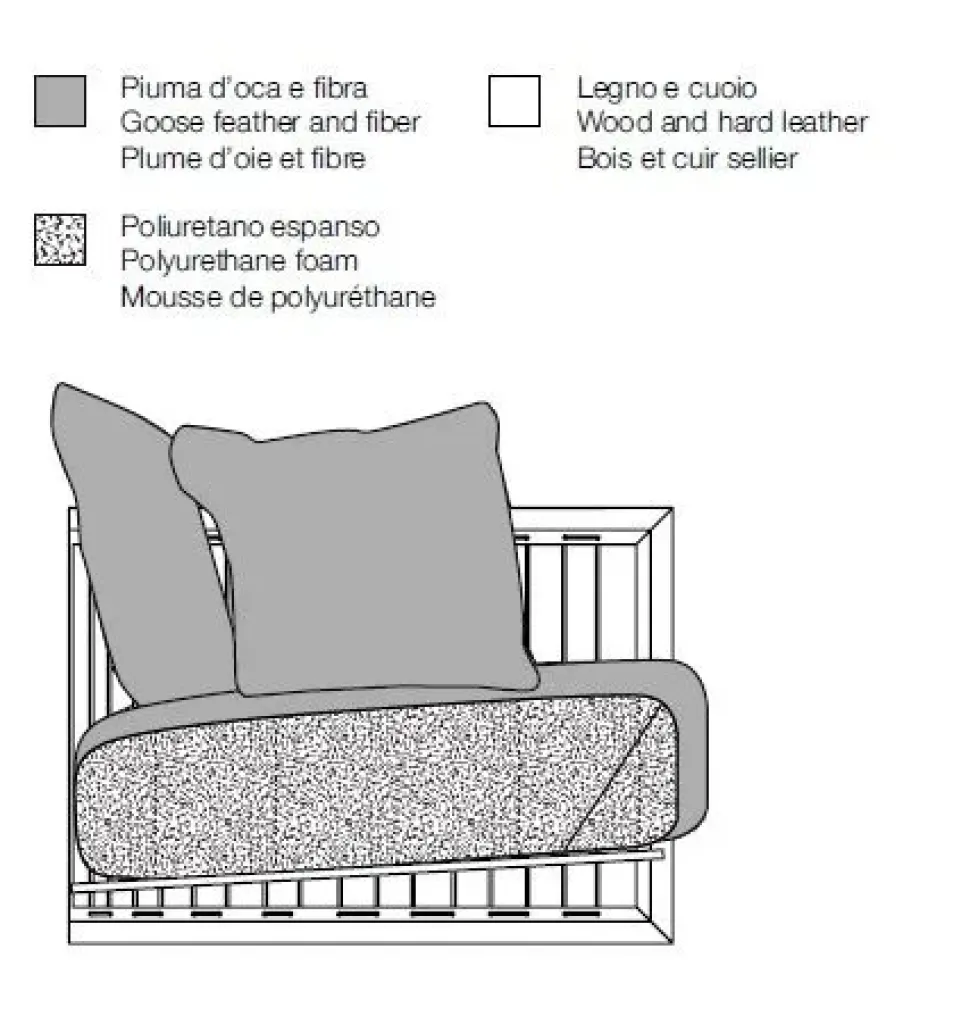 Cuscino di seduta in poliuretano espanso a densità differenziata, con rivestimento esterno in misto piuma d’oca e fibra di poliestere.