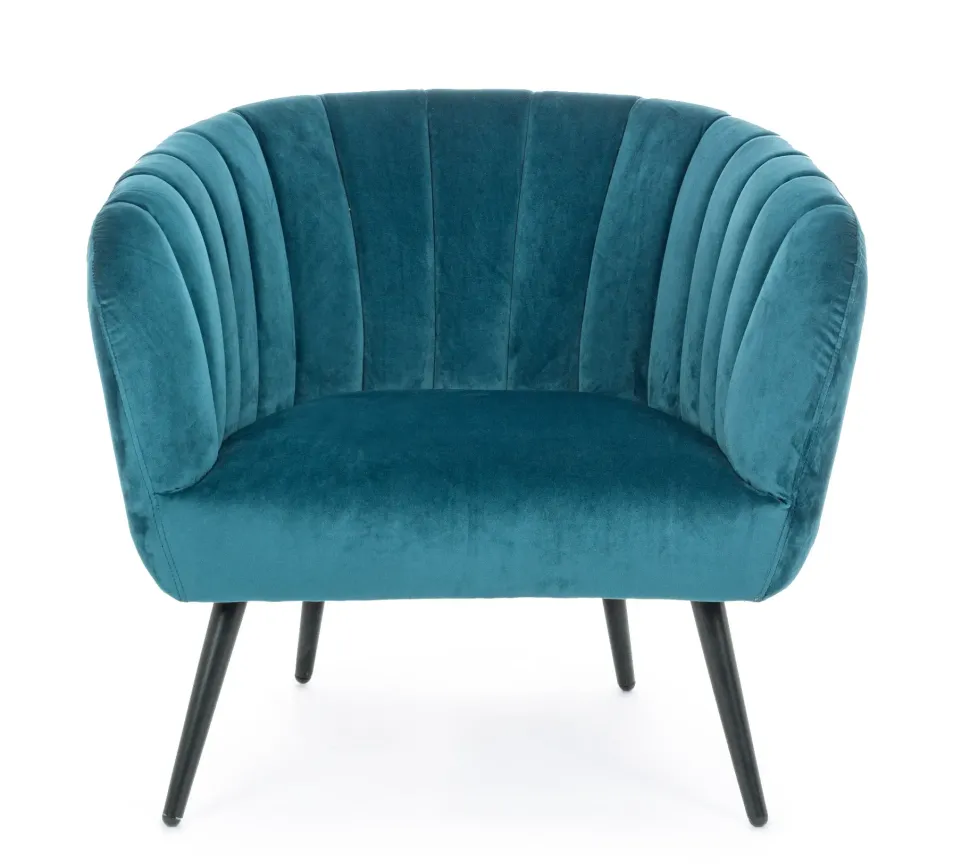 - Quali sono le caratteristiche dei materiali?La poltrona ha un rivestimento non sfoderabile in tessuto effetto velluto blu pavone e gambe in acciaio verniciato, che garantiscono resistenza e stile.