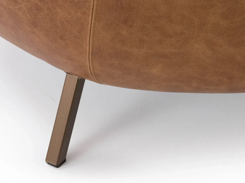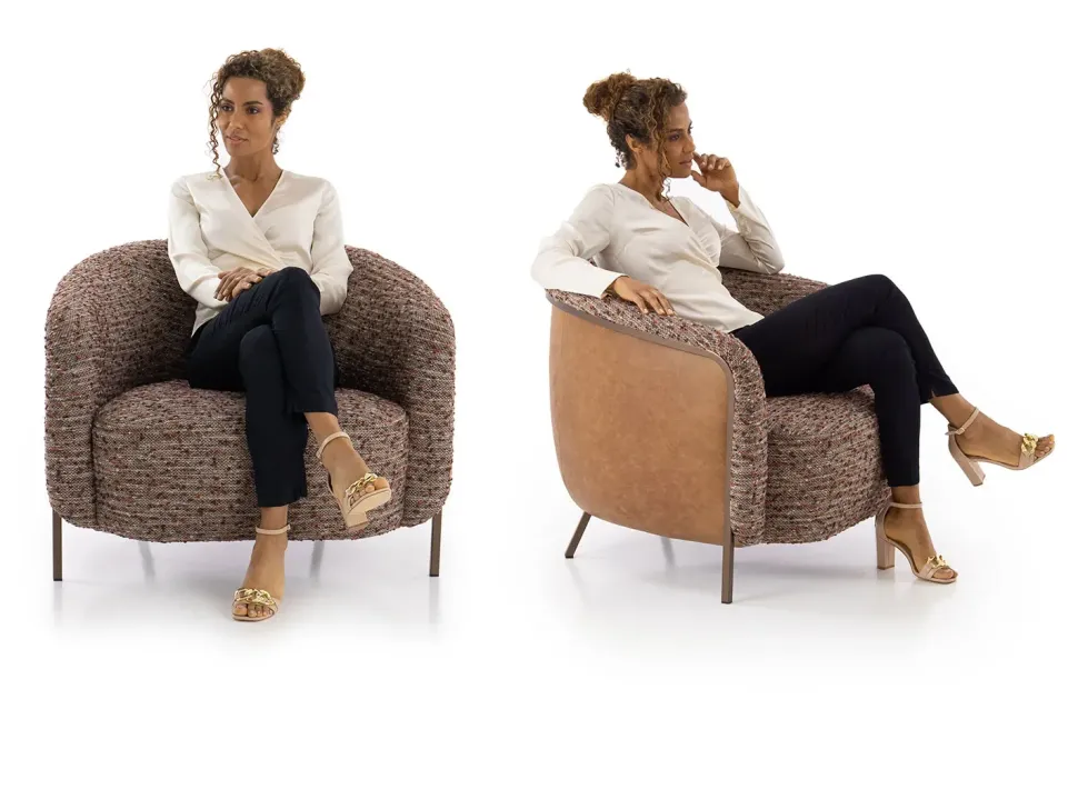 Un profilo portante in metallo finitura bronzo, dalla sezione quadrata, definisce i piedini anteriori e prosegue lungo i braccioli per poi avvolgere lo schienale curvato, enfatizzandone le linee fluide e contemporanee.