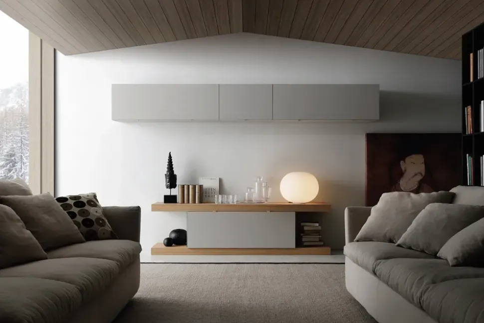 Per valorizzare un living design prediligi una parete attrezzata che mantenga una certa coerenza di stile, come questo modello F2/ twinse line con pensili a prezzo ribassato.
