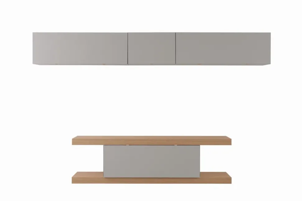 Complemento a pavimento bifacciale con piani orizzontali in tamburato di spessore mm 80, impiallacciati in Rovere Naturale, finitura opaca. Le linee verticali laterali di spessore 8 mm, sono composte da cristalli extra chiari temperati, Il pannello retro da particelle di legno laccato opaco goffrato color Grigio Forme’s. Completa il sistema base un contenitore a ribalta da cm. 120. Appesi al muro 2 contenitori laterali da cm. 120 e un contenitore centrale da cm. 60, laccati opaco goffrato color Grigio Forme’s