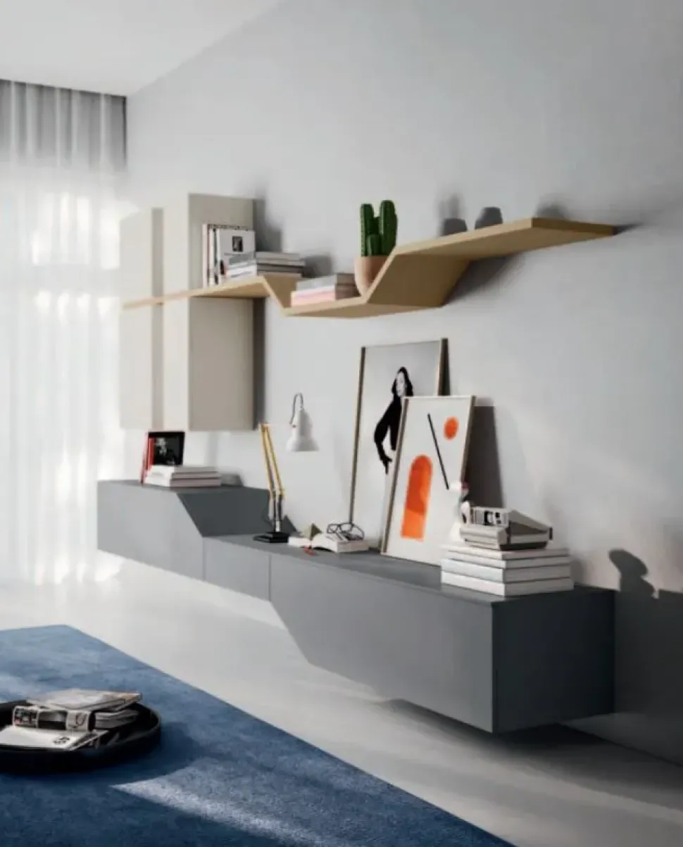 Completa l’arredamento del tuo living con un mobile sospeso dall’estetica raffinata: la composizione nell’immagine saprà ultimare lo spazio sfruttando bene ogni angolo.