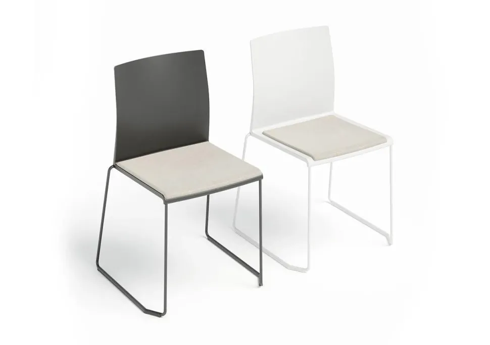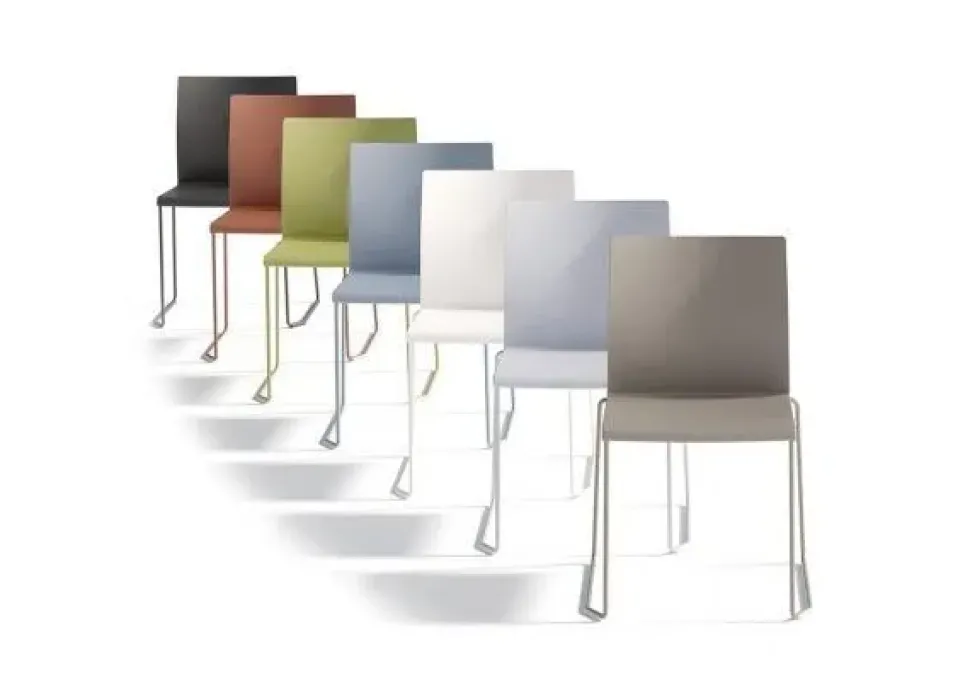 La versione di Artesia in promozione prevede la struttura a slitta in filo con braccioli con struttura verniciata nei colori grigio perla, mattone, lime e azzurro, e scocca in