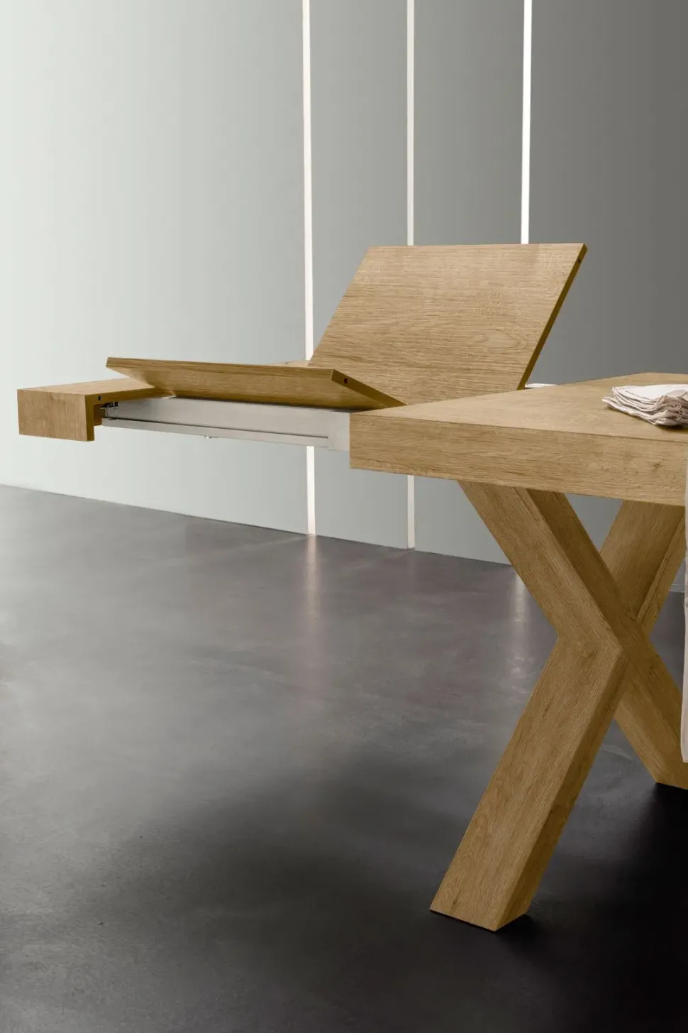 Sarà base di lavoro per i disegni dei bambini, ospiterà giochi da tavolo e tornei per gli appassionati di carte, sopporterà i più duri compiti culinari grazie al piano alto e allungabile. Con le sue linee decise si adatta perfettamente ad una sala minimal ma anche ad una stanza più ricca di arredo.