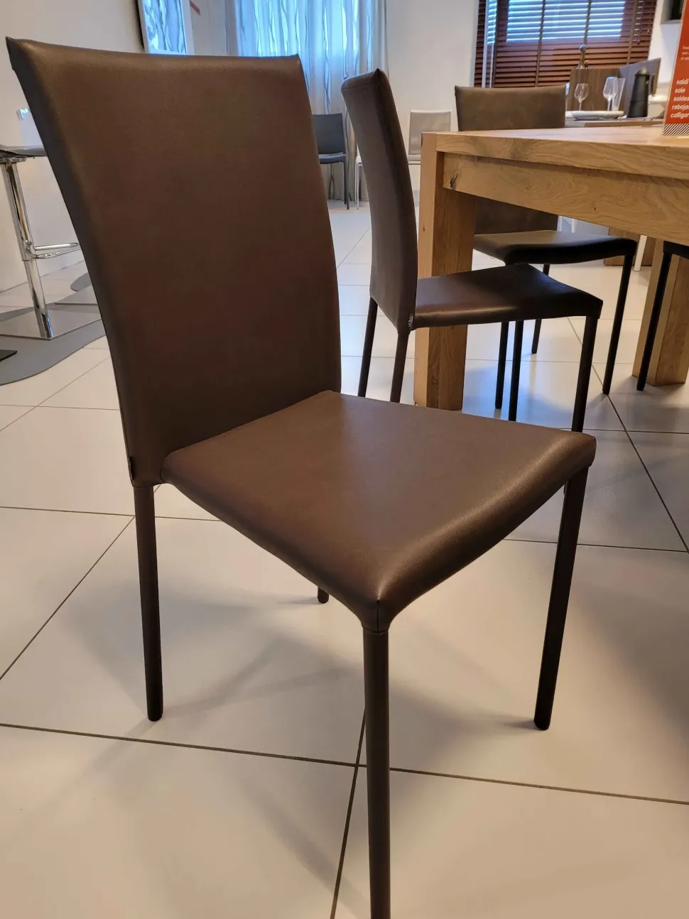 La struttura è realizzata in metallo ed completamente rivestita in eco pelle color moka e grazie allo schienale leggermente inclinato favorisce la postura corretta quando si è seduti