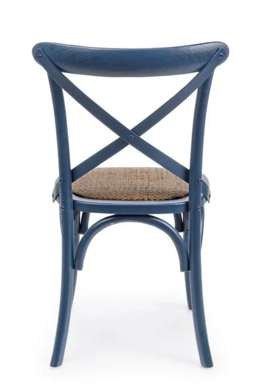 Sedia in legno di OLMO laccato blu con schienale incrociato e seduta in Rattan naturale