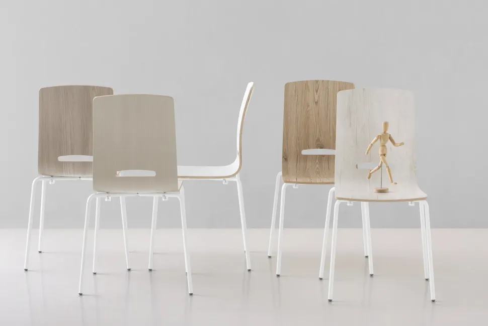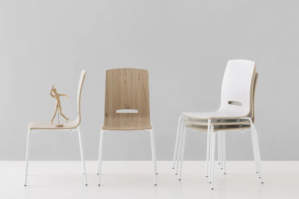 Seduta impilabile dalle curve delicate ed essenziali, con scocca in legno multistrato nobilitato melamminico effetto legno o monocolore, da abbinare ai piani o alle gambe dei tavoli.