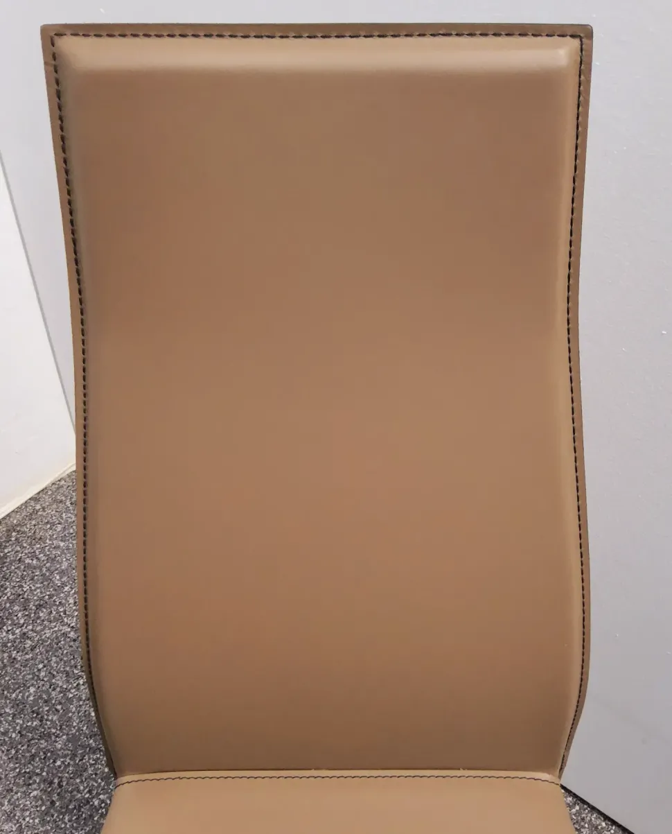 Sedia con struttura in acciaio, interamente rivestita in cuoio colore fango. Cuciture a contrasto nere.