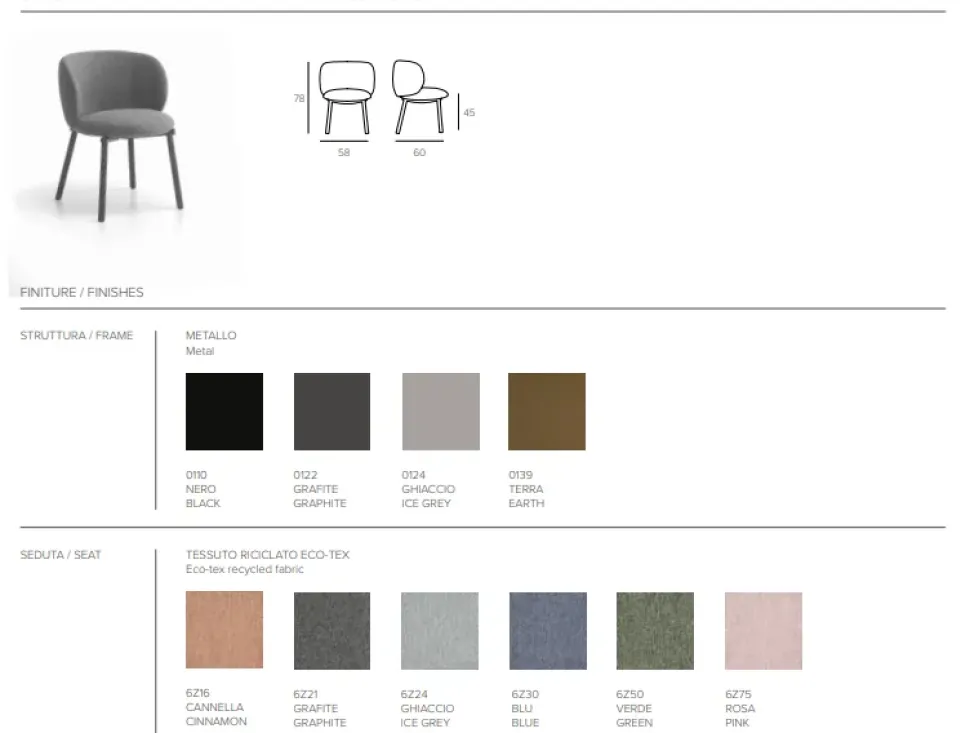 Una sedia dal tratto comodo, disponibile anche nella versione poltrona e pouf. La struttura della sedia è in metallo, il rivestimento in tessuto riciclato Eco-Tex.