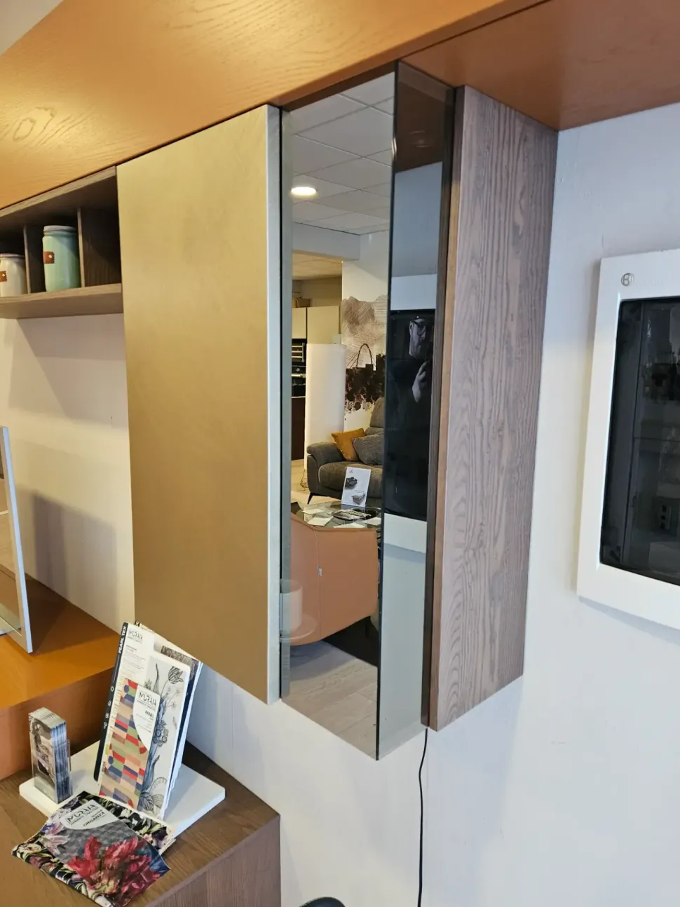 - Invece nella parte superiore della composizione abbiamo un pensile, con un angolo in vetro (come nella foto), che assieme all’elemento a giorno Scarabeo e al pensile a vasistas, creano un’atmosfera più moderna e accogliente.