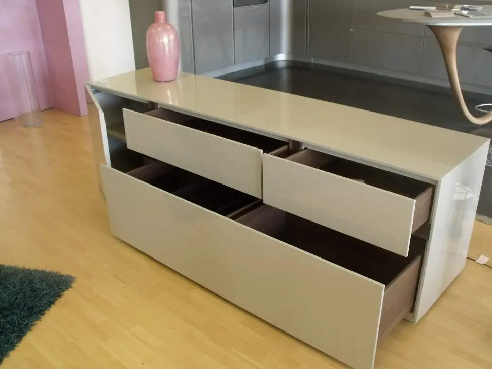 La madia ha un anta a sinistra, due cassetti superiori ed un cestone inferiore con guide ammortizzate, e vassoietto interno scorrevoli porta oggetti in finitura rovere spessart.