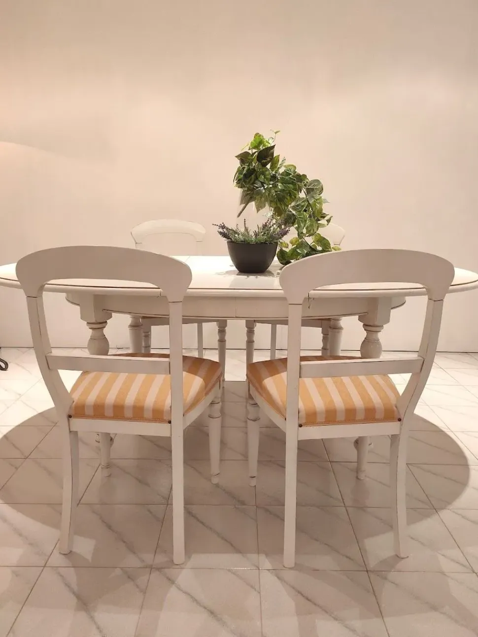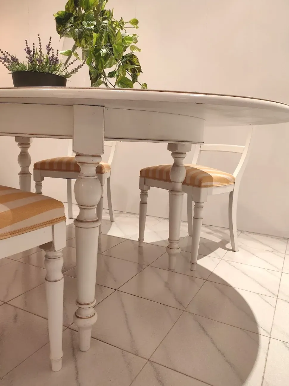 Nell’offerta sono comprese le 4 sedie imbottite, sempre di BetaMobili e della collezione la tradizione, in legno laccato bianco consumato anticato oro.