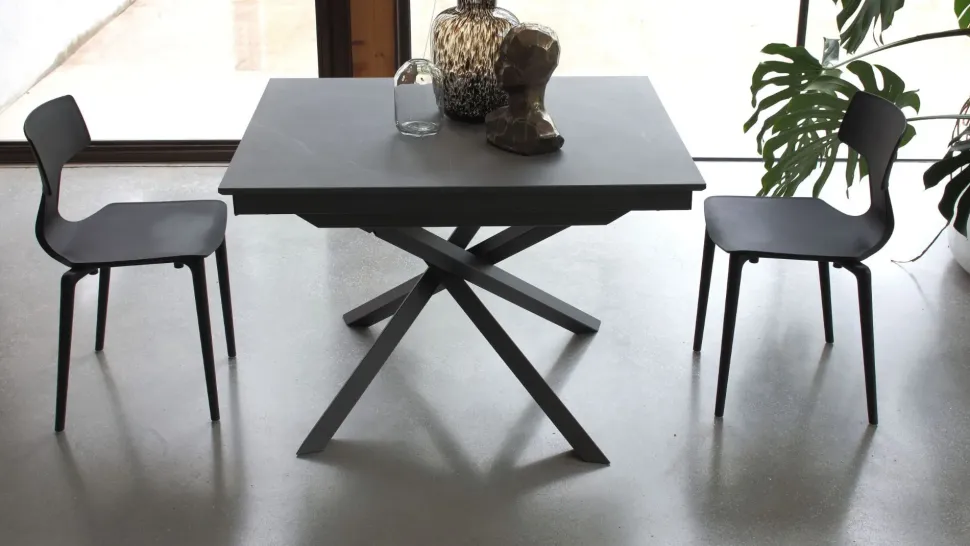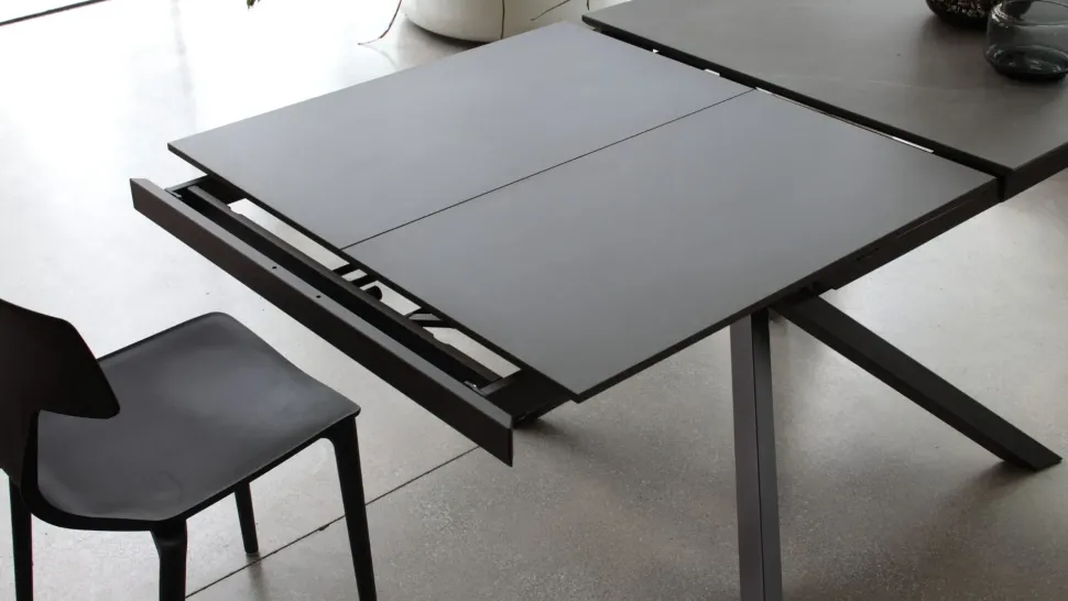 Tavolo da pranzo, struttura allungabile in metallo, meccanismo telescopico, piano in nobilitato o ceramica.