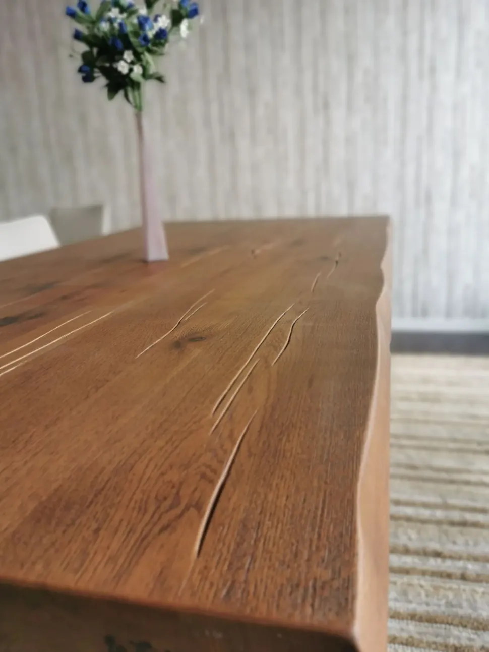 Tavolo Le Fablier mod. Bangkok in legno di rovere invecchiato con bordo scortecciato. Dimensioni (in cm): L 200 x P 100.