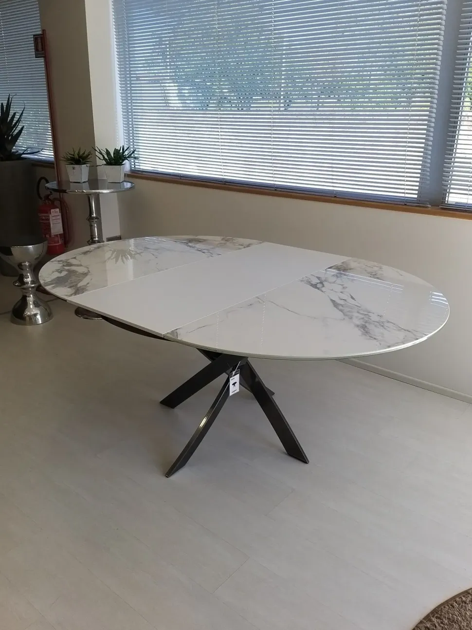 Piano in ceramica diametro cm 125 con apertura simultanea, allungabile per mezzo di prolunga interna apribile in finitura laccato bianco opaco fino a cm 175 creando una forma ovale.