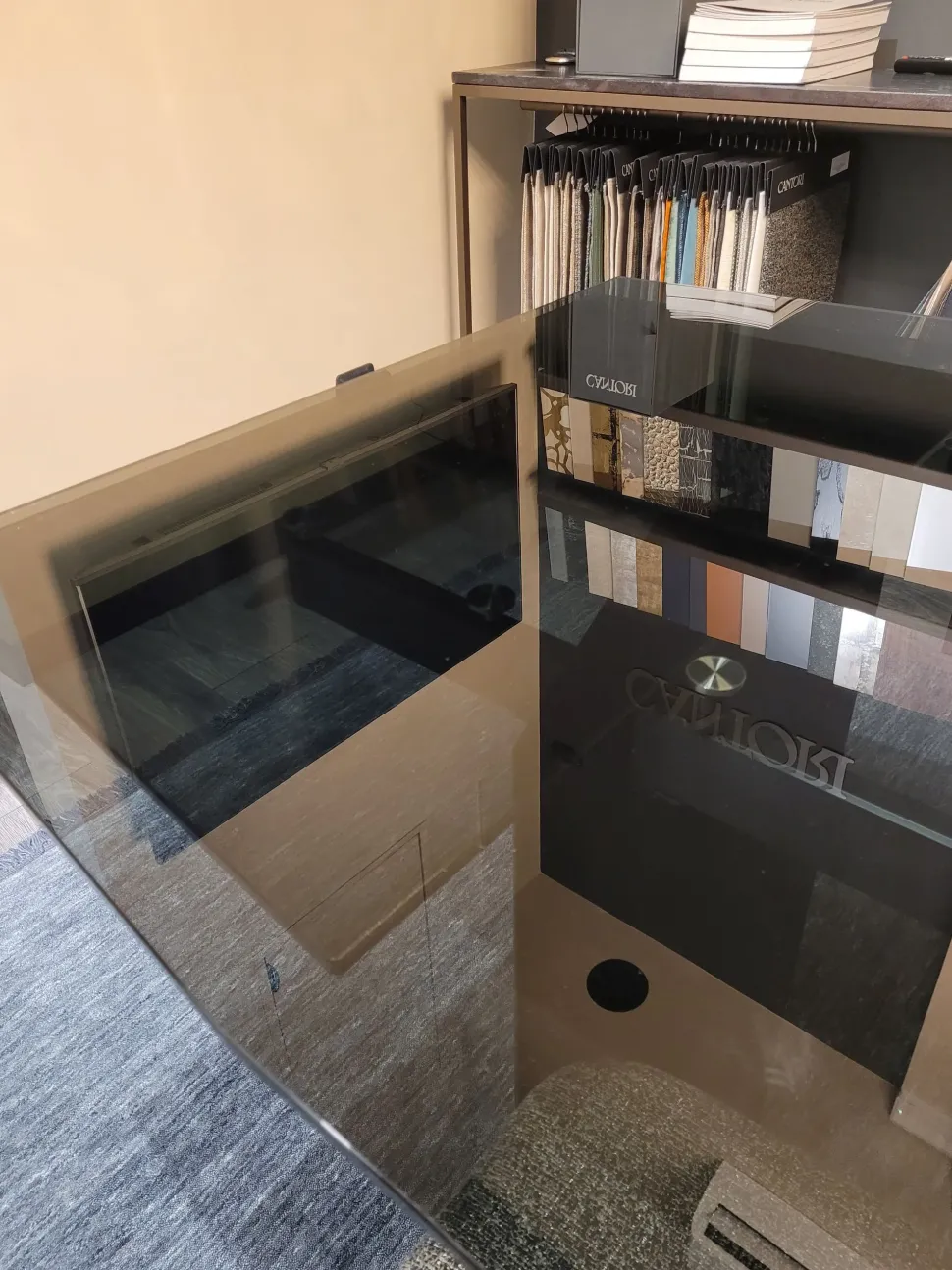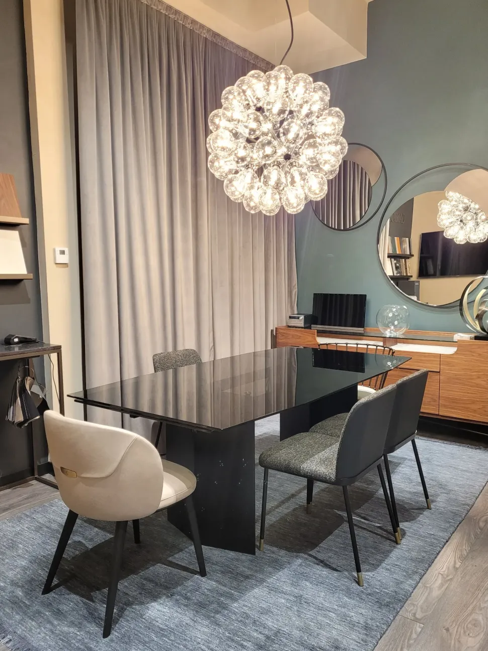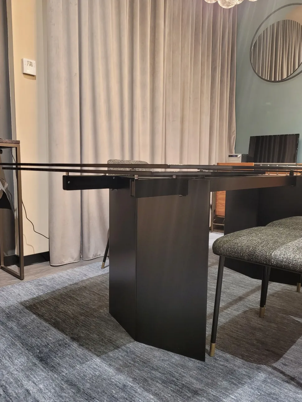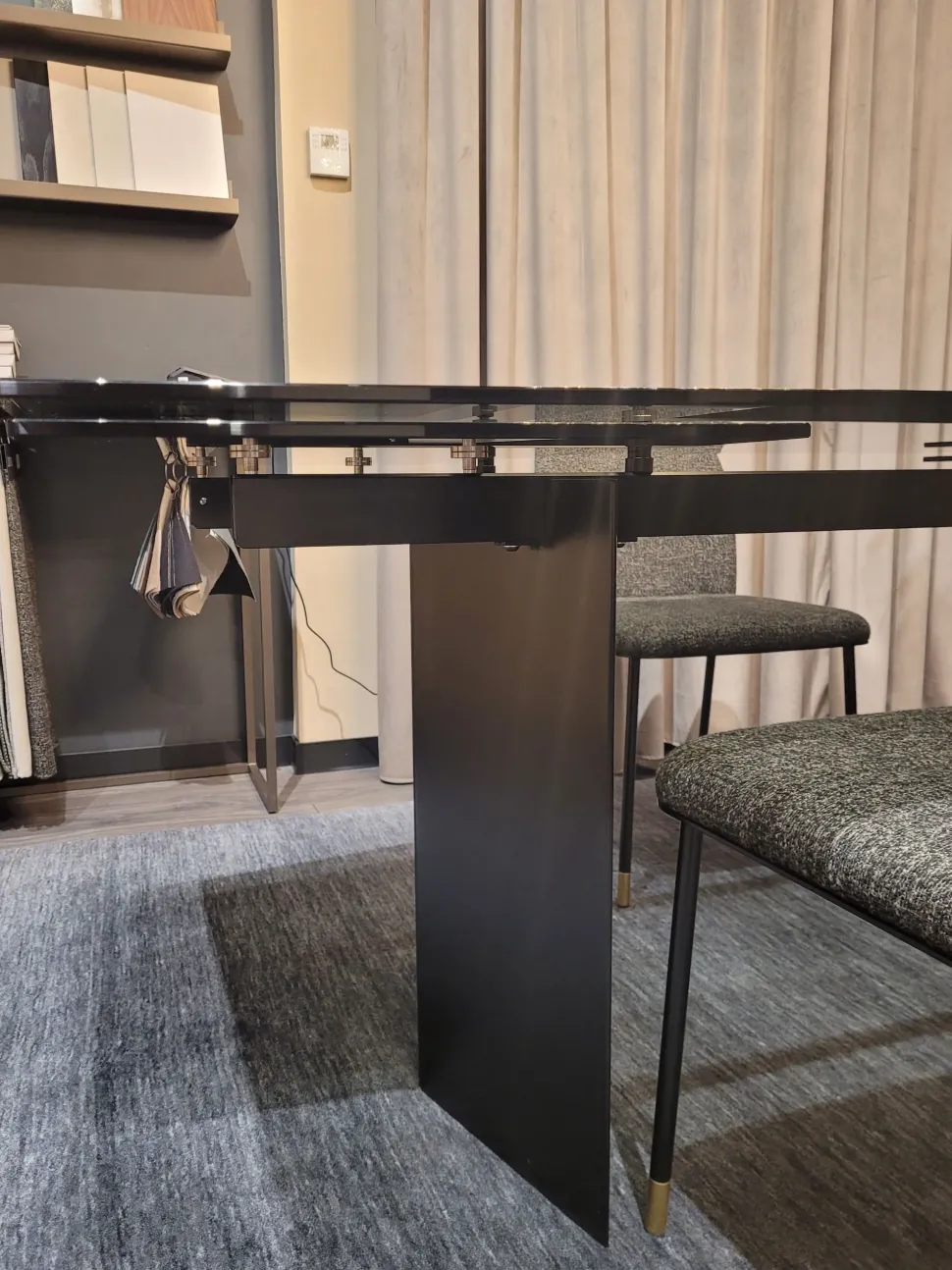 Tavolo in vetro, proposto sia fisso che nella versione allungabile mediante un sofisticato, ma semplicissimo, meccanismo che movimenta le allunghe con facilità.