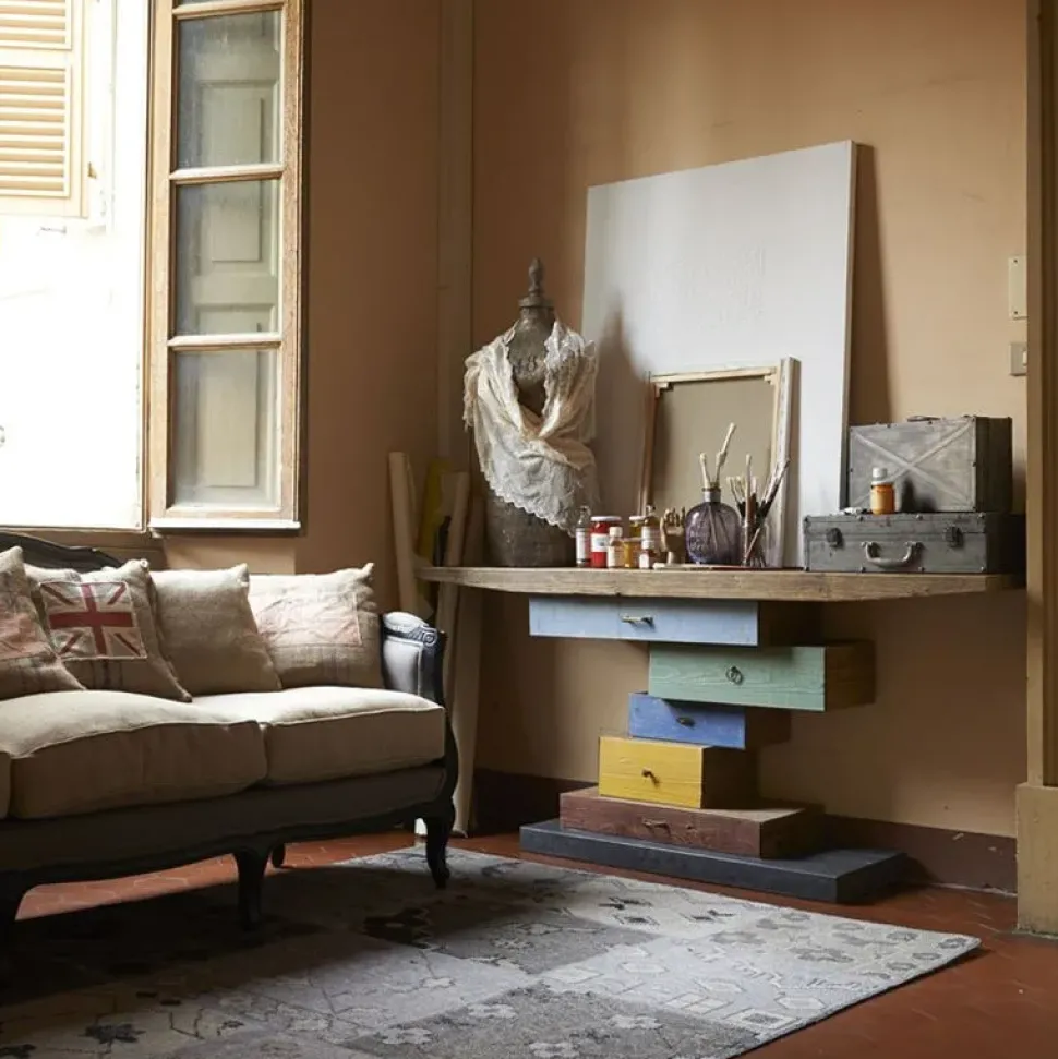 Console 5 cassetti, in legno vecchio finitura Naturale, frontale multicolor, base laccata e cerata a pennello color Lavagna.