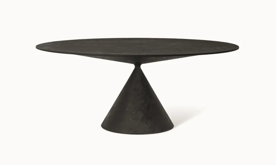 Il tavolo Clay di Desalto è uno scenografico tavolo-scultura che nasce dall’unione di due volumi. Il piano e il basamento sono infatti due coni in equilibrio uno sull’altro. Il basamento del tavolo in offerta è in poliuretano rigido mentre il piano è in MDF interamente rivestito tramite spatolatura manuale. Clay è di colore nero, la finitura è PIETRA LAVICA, con dimensione cm 160 accoglie circa 7 commensali.