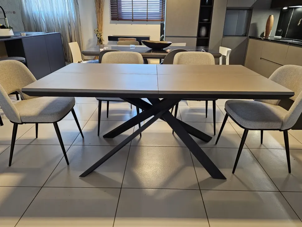 Tavolo allungabile 4×4, sistema unico nel suo genere in quanto si allunga e si allarga nello stesso tempo, piano in finitura cemento tortora CM90, telaio e base in metallo finitura grafite MT98, n.10 posti