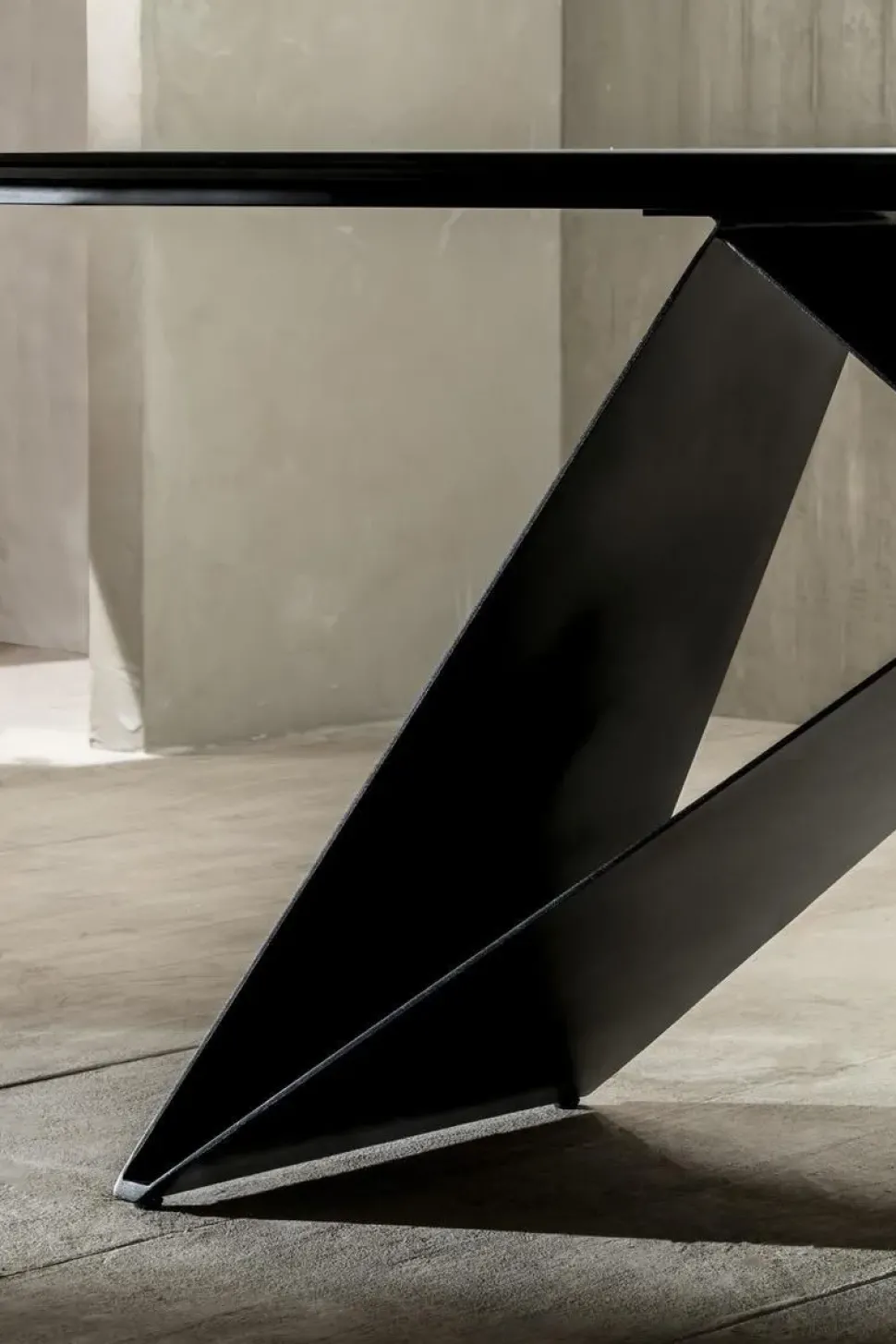 Tavolo fisso con top in ceramica Nero Portoro su vetro. Gambe in metallo verniciato Nero.