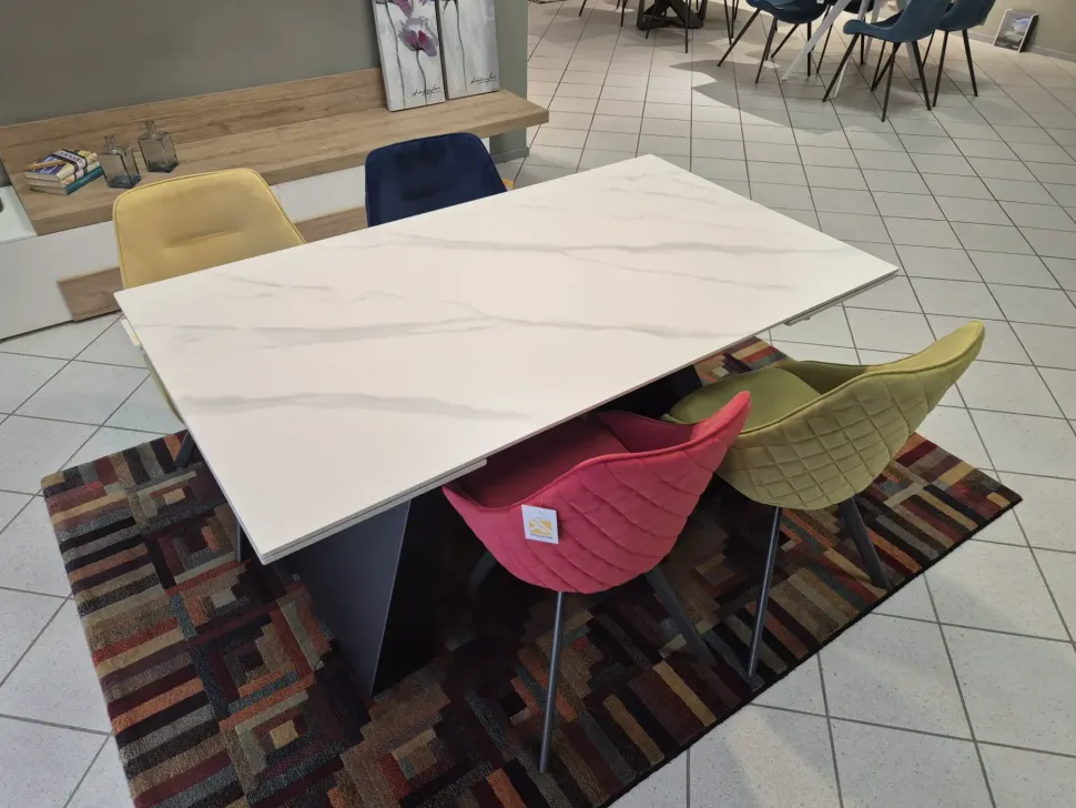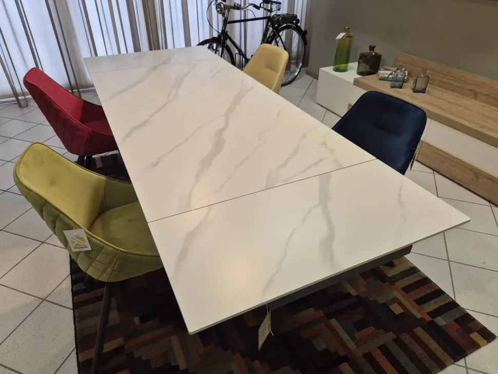 Tavolo allungabile con gambe nere geometriche a trapezio . Piano bianco in gres porcellanato con venature effetto marmo.