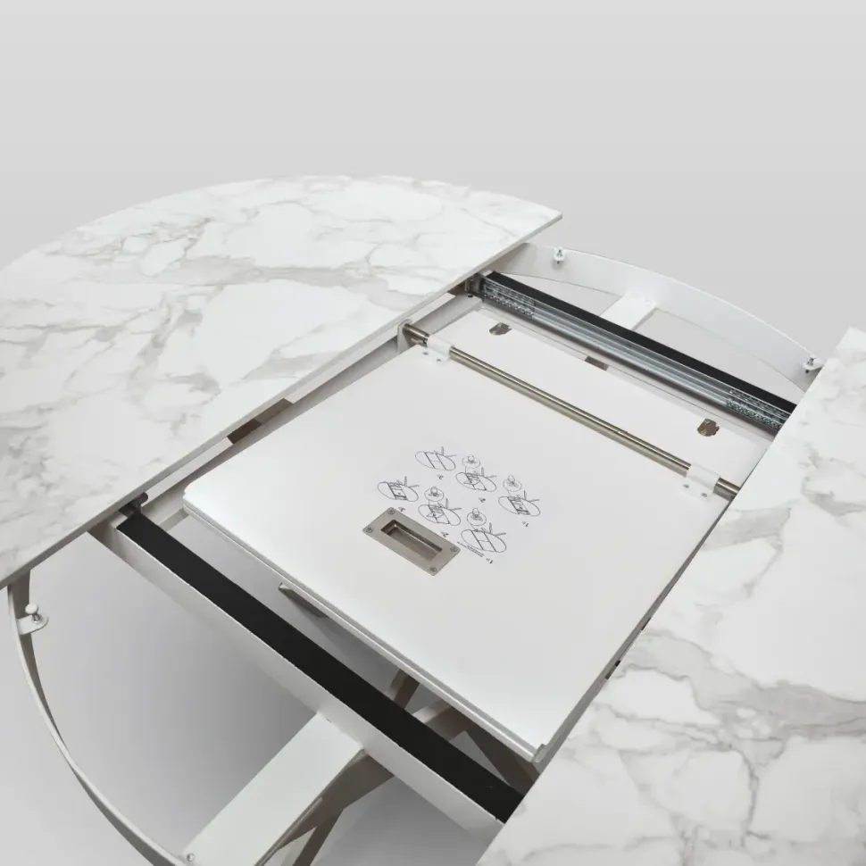 Struttura in metallo finiture bianco, piano in ceramica opaca finitura Bianco arabescato.