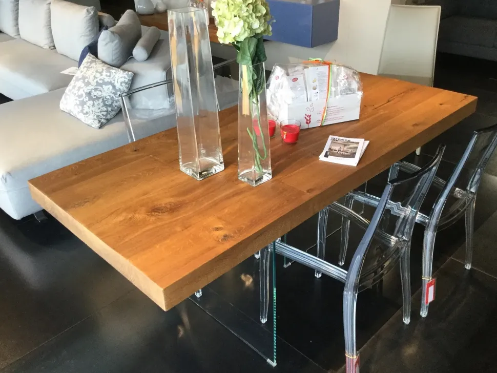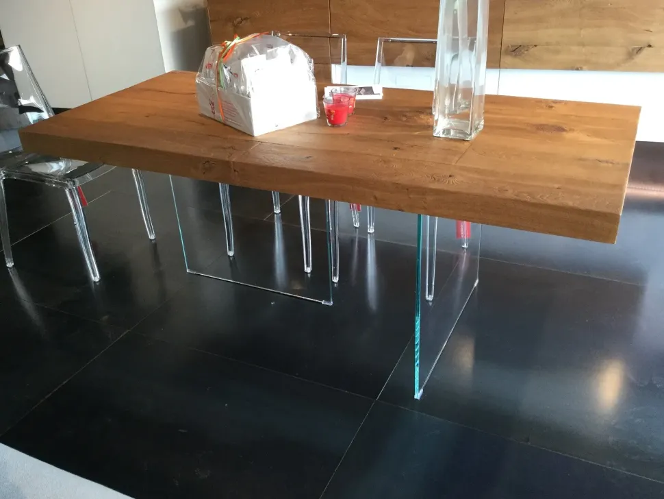 Il tavolo in offerta, modello Air Wildwood di Lago, è un tavolo rettangolare ad effetto “sospeso”. Air ha infatti due gambe in vetro extrachiaro temperato trasparente, spessore 1,2 cm, che sembrano invisibili. Tale caratteristica da la sensazione che il piano stia fluttuando nella stanza. Il piano, spessore 8 cm, è in Wildwood Naturale, particolare finitura di Lago data da un legno rovere centenario sottoposto a termotrattamento per una maggiore resistenza. Al tatto, il piano presenta le venature del legno e trasforma l’oggetto in una esperienza sensoriale.