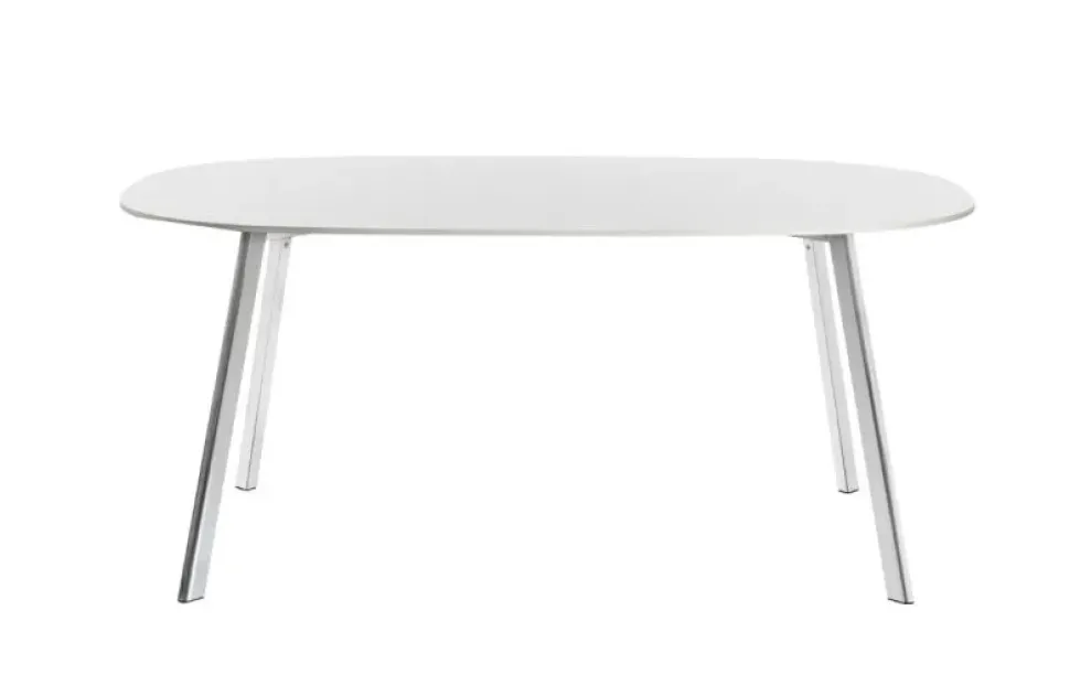 Il tavolo Deja-Vu è offerto con gambe in alluminio lucidato e un piano bianc.
