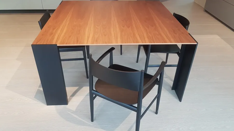 Il tavolo “Metallico” di PORRO si caratterizza per la leggerezza di piano in alluminio massiccio rivestito in noce canaletto e gambe realizzate in lamiera d’alluminio nero con spessore 12 mm. L’alluminio massiccio conferisce a questo oggetto solidità e leggerezza, oltre ad essere ecologico. La particolare finitura superficiale, vellutata al tatto ed esteticamente pregiata, viene ottenuta tramite una verniciatura catalizzata ad alto spessore e alle successive fasi di levigatura e ceratura a mano, che ne conferiscono l’effetto materico. Adatto sia per le sale da pranzo che per zone riunione. VERA OCCASIONE per gli amanti del design italiano Dimensioni cm 148 x 148