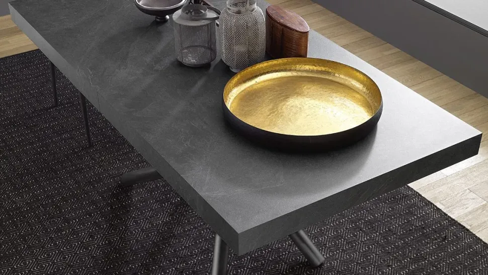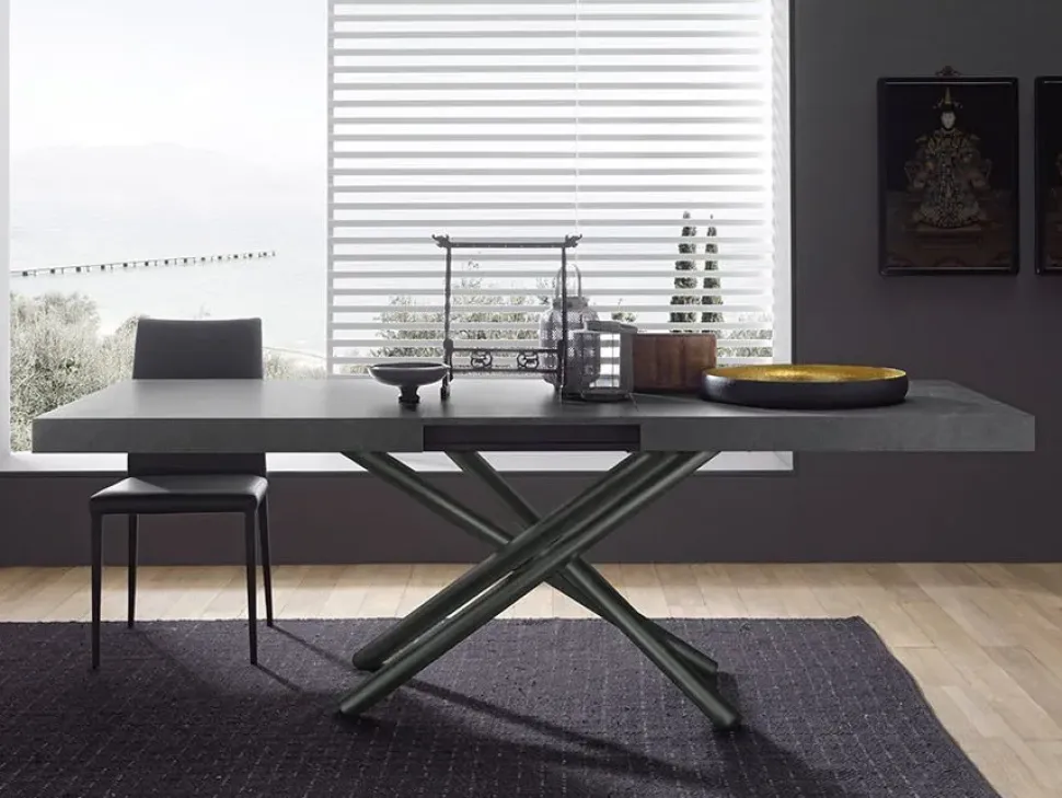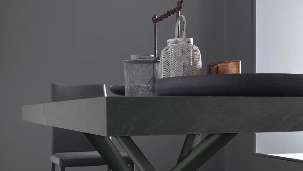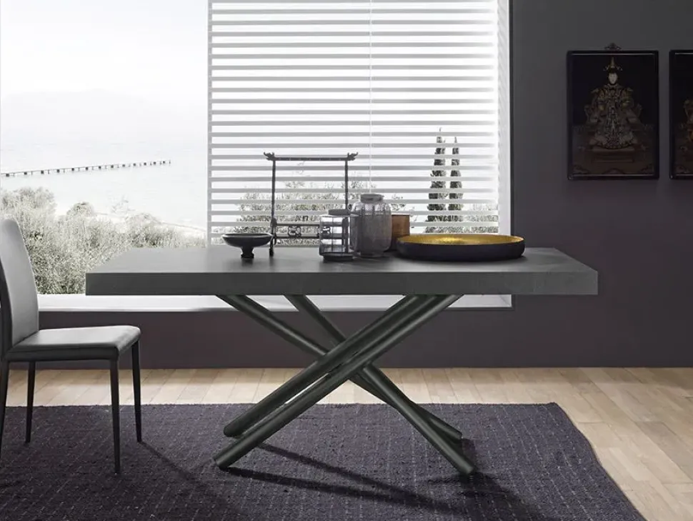 Fahrenheit si esprime attraverso la sua singolare struttura ad intreccio in metallo, inconfondibile nel design, espandibile nella sua versione allungata. Il piano ad alto spessore è anch’esso un elemento caratterizzante come in questa versione in nobilitato ardesia, e si staglia in centro stanza come un’opera scultorea contemporanea.