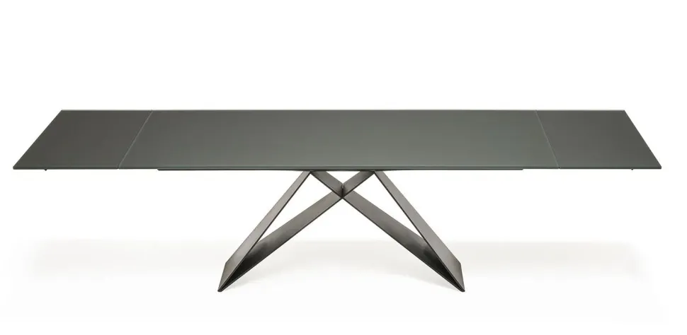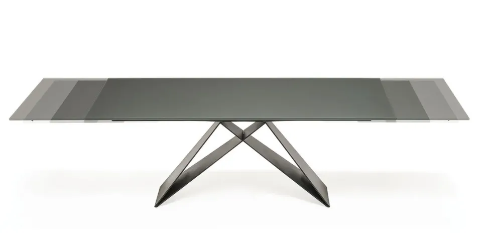 Tavolo allungabile con base in acciaio verniciato goffrato titanio (GFM11), bronzo (GFM18), graphite (GFM69) o nero (GFM73). Piano e prolunghe in cristallo 12mm extrachiaro acidato verniciato graphite.