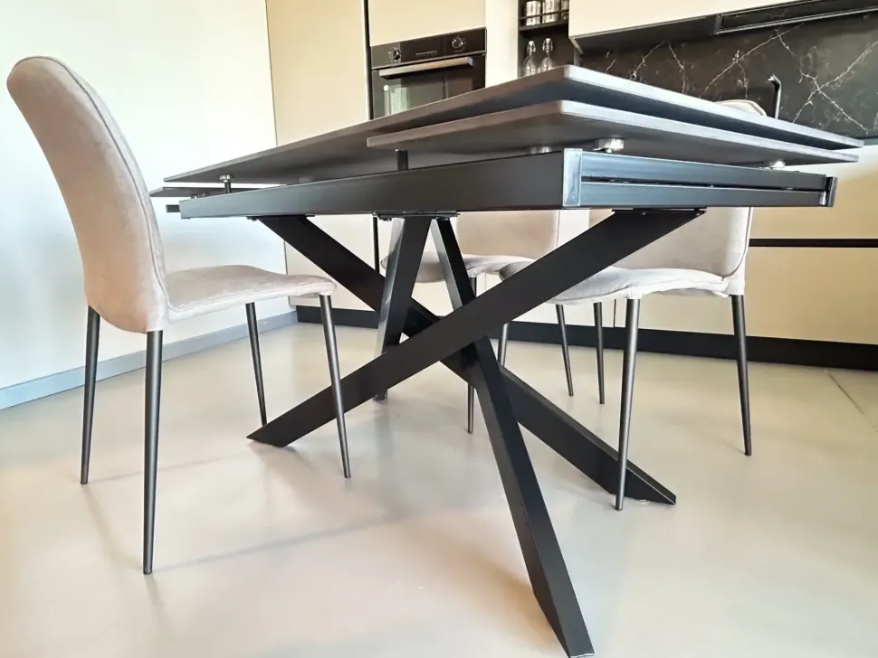 Linee moderne, piano in ceramica effetto marmo nero e un basamento centrale a stella: Match 2 è il tavolo allungabile che unisce stile e praticità. Accoglie fino a 10 persone senza sacrificare spazio né comfort. Resistente, raffinato, perfetto per ambienti contemporanei.