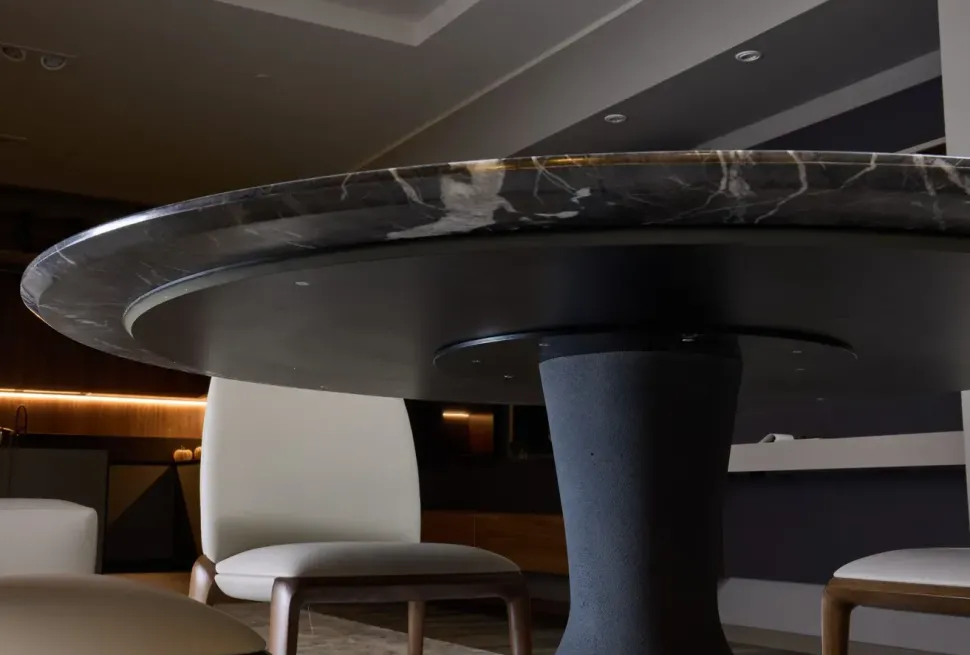 tavolo rotondo con scultorea base centrale in quarzo resinato effetto pietra, a forma di vaso greco