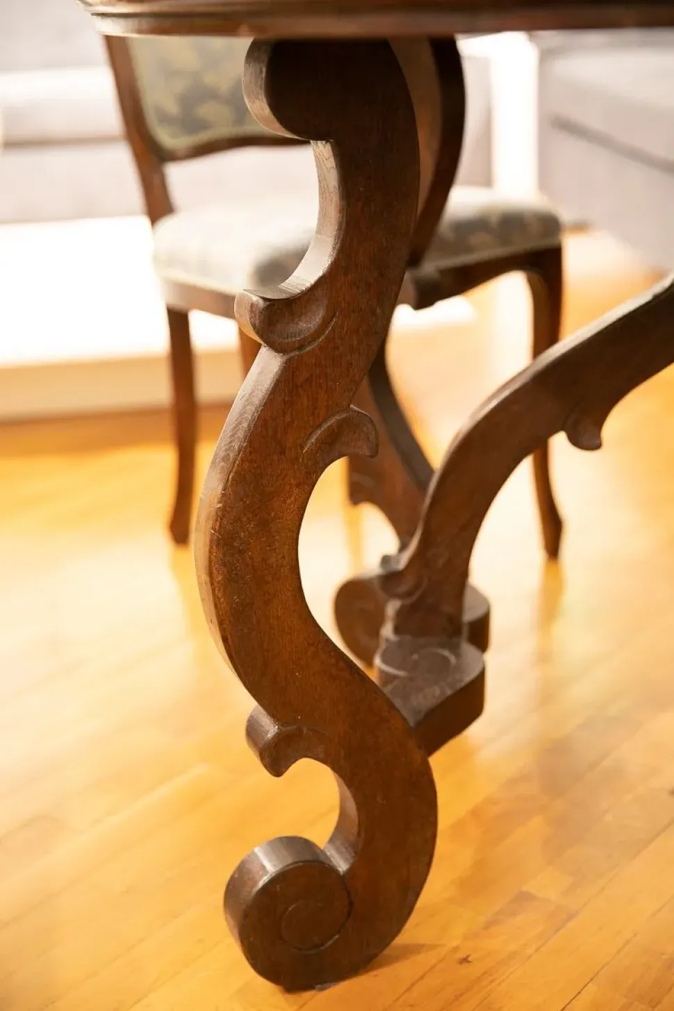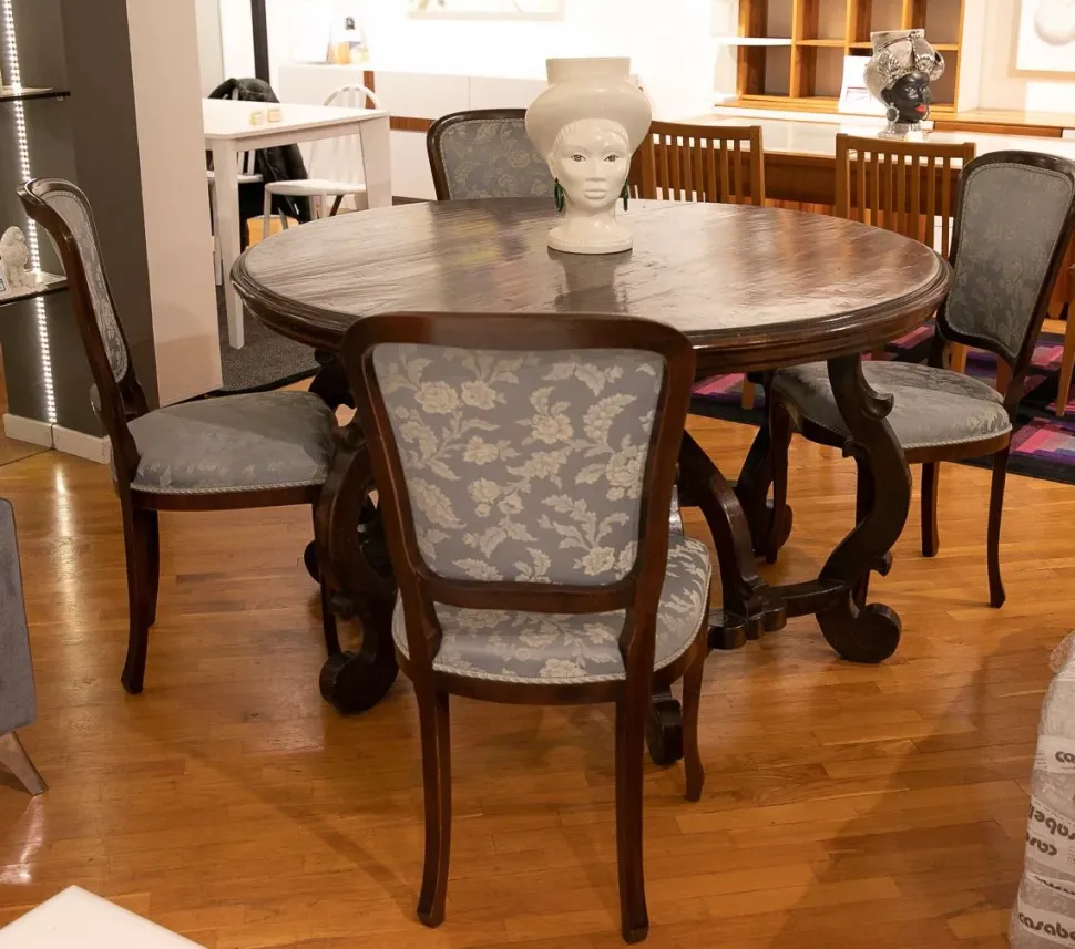 - I mobili vanno scelti con cura non solo per lo stile e i materiali con cui sono stati realizzati, ma pure per le dimensioni e lo spazio che occupano negli interni domestici: il tavolo Rotondo Tavolo fratino legno antico massello noce + n. 4 sedie ha una lunghezza che va da 131 a 160 cm, risultando perciò ideale per locali di diverse volumetrie.