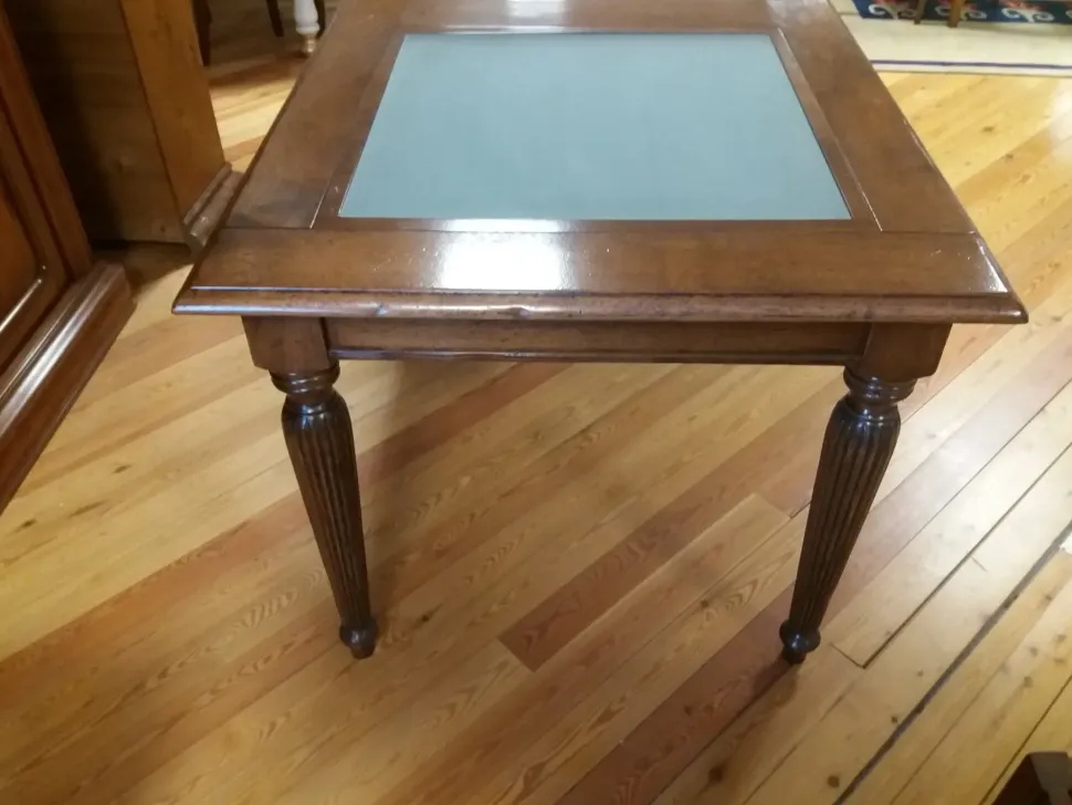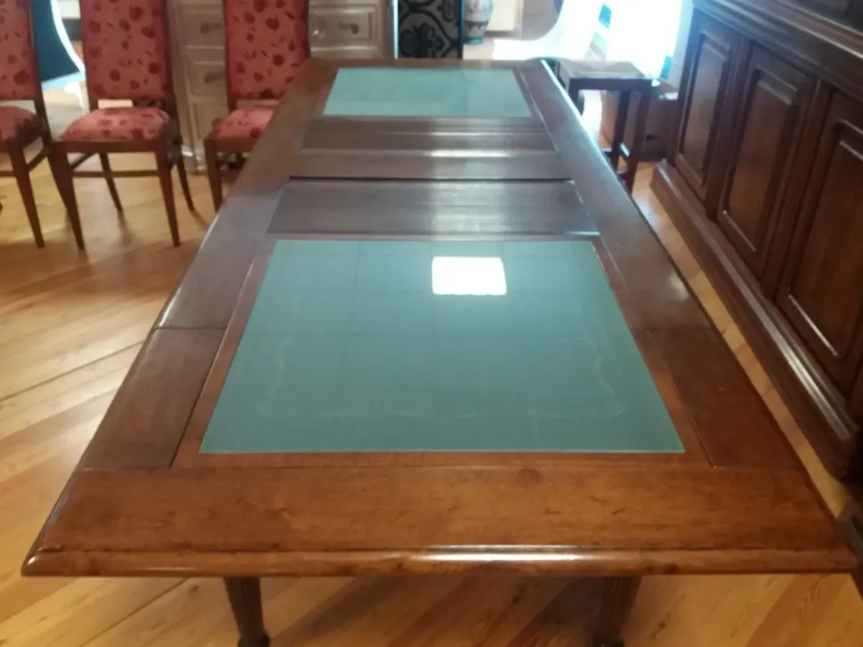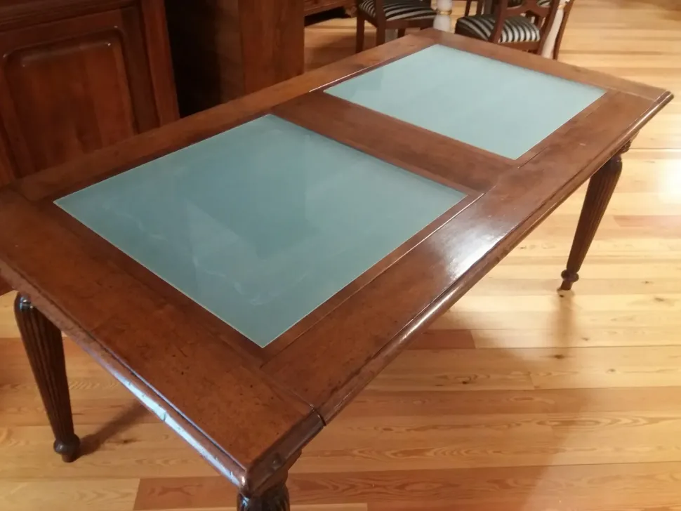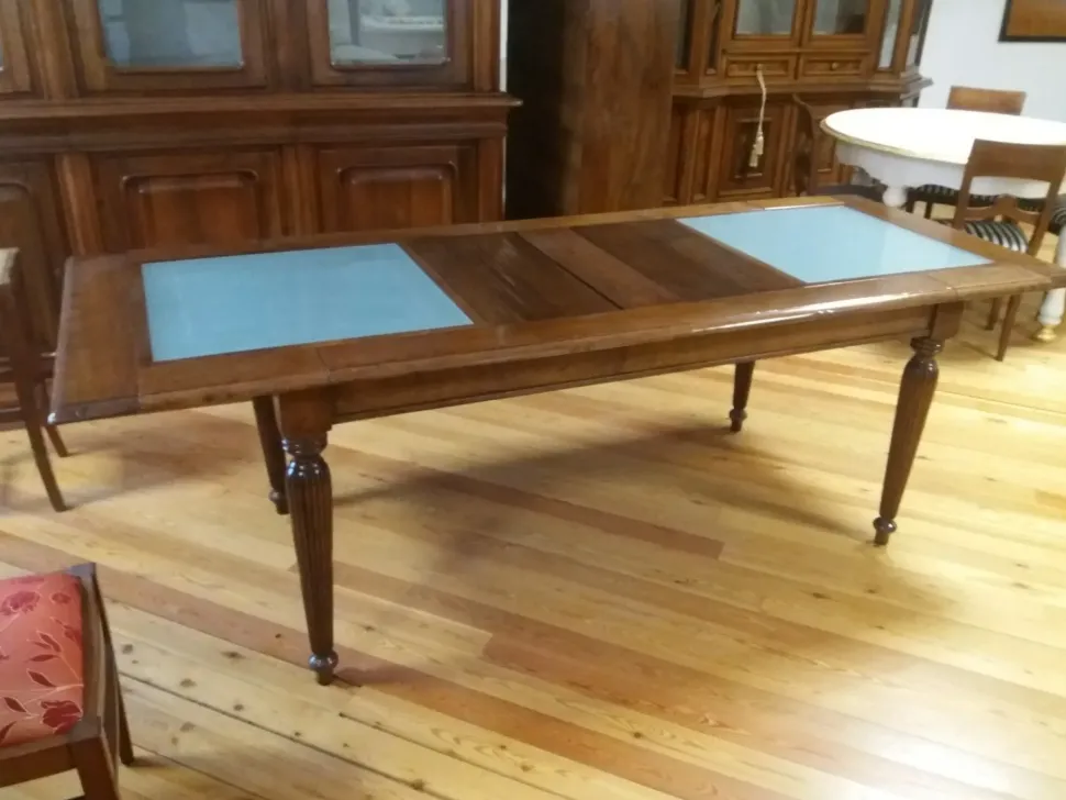 Tavolo Rettangolare in noce con inserti in vetro satinato e decorato, dotato di sistema innovativo di apertura con 2 serrandine scorrevoli a scomparsa (vedi foto).