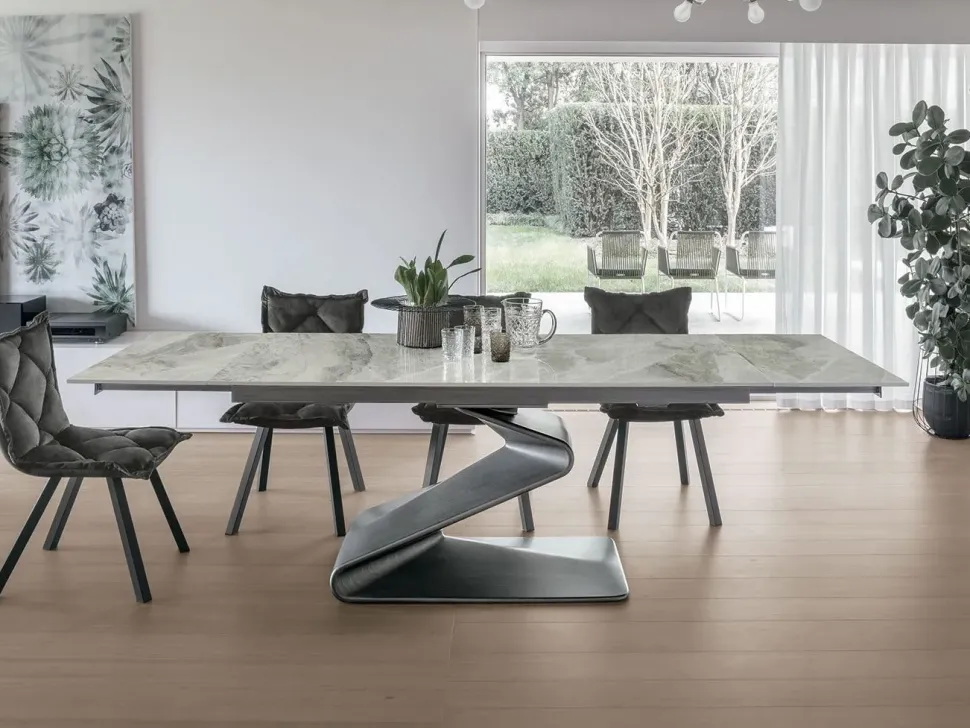 Tavolo allungabile con basamento in agglomerato.